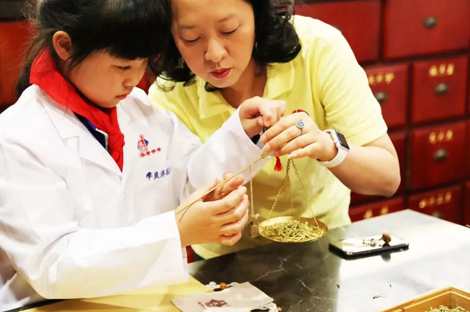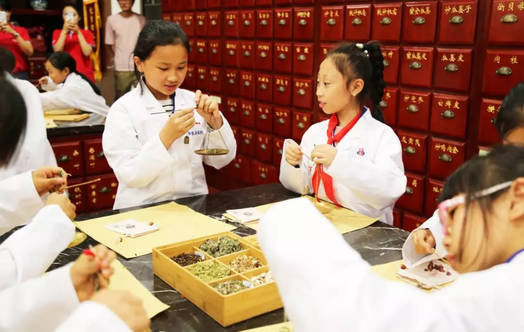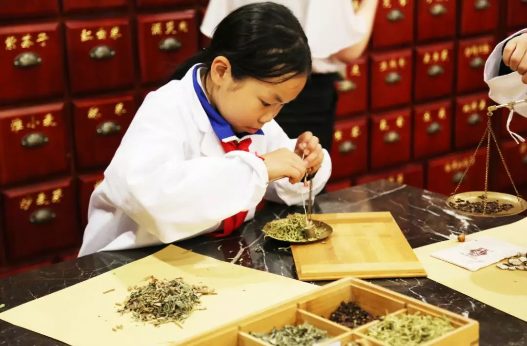 緊接著,學(xué)生們換上“白大褂”,開(kāi)始了“小小中藥師”的體驗(yàn)活動(dòng)。