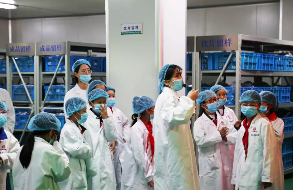 隨后,學(xué)生們來(lái)到了煎制服務(wù)中心。由于煎制服務(wù)中心要確保衛(wèi)生無(wú)污染,所以進(jìn)入之前,學(xué)生們戴上了一次性的口罩、帽子和鞋套。