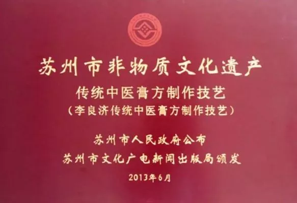 同時(shí),李良濟(jì)傳統(tǒng)膏方制作技藝于2013年入選蘇州市非物質(zhì)文化遺產(chǎn)目錄。