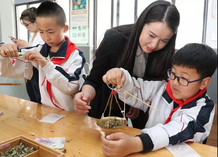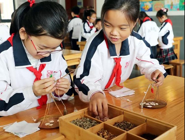 學生們在聽取有關中藥知識后,開始稱重艾葉、丁香、金銀花等6種中藥材,然后塞進布包,一個小小的驅蚊包就做成了。
